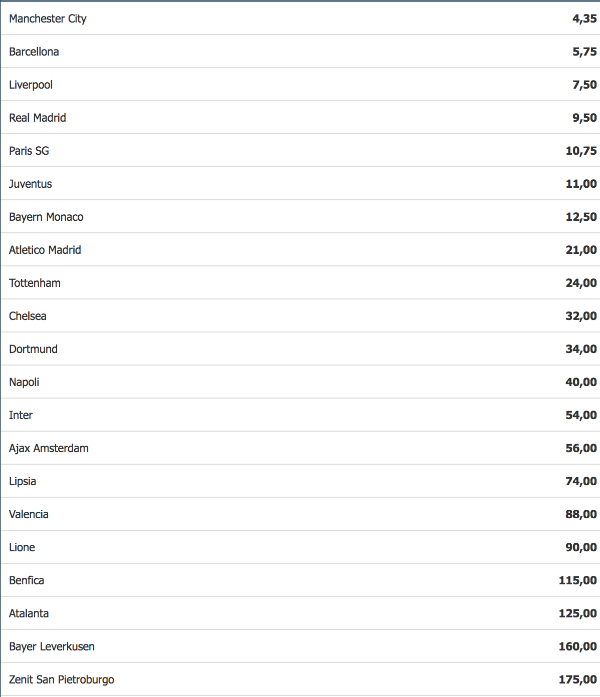 Ecco le quote più alte bookmakers sulla vincente della prossima Champions.